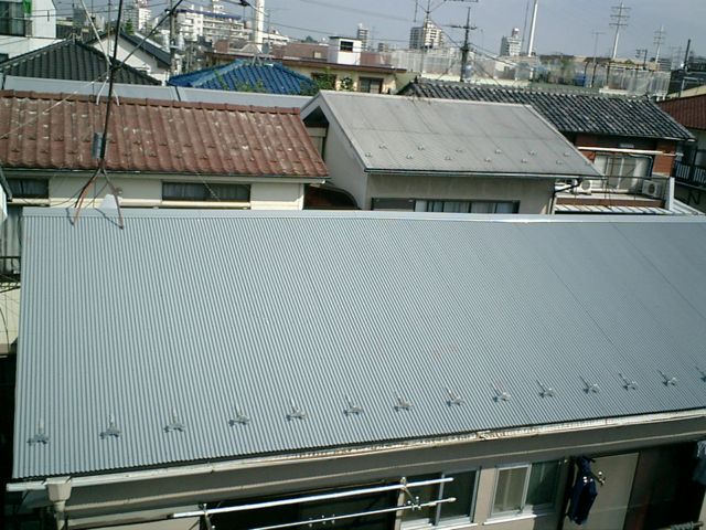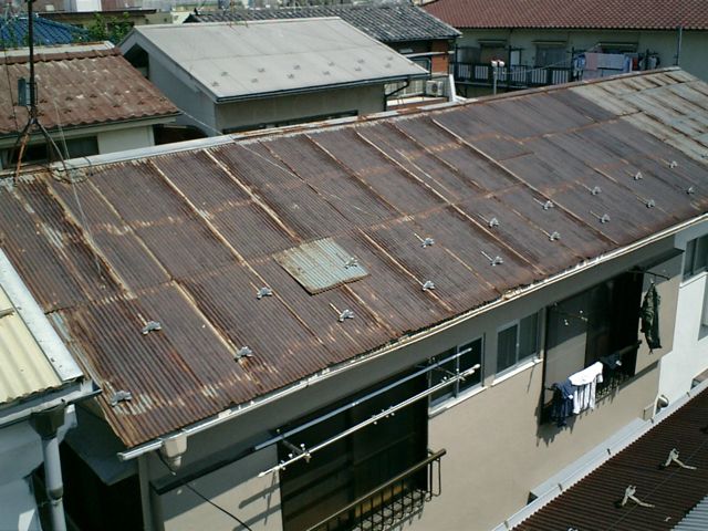 木造アパート屋根葺き替え カラー小波鋼板葺替工事 お客様からのご依頼内容 台風や大雨が心配です。屋根材の補修・塗装を行って欲しい。 施工上の留意点 屋根材の補修・塗装を行いました。 葺き替え前 葺き替え後 完了後のお客様の声 台風・大雨でも安心です。